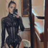 UPDATE: Kim Kardashian has set social media ablaze with her latest fashion statement, showcasing a bold thong bodysuit paired with a sheer mesh maxi...