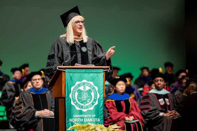 Cholewa addressed students during three separate ceremonies held at the Chester Fritz Auditorium. The day began with a professional and graduate ceremony at 09:00, followed by two undergraduate ceremonies at 13:00 and 16:00. In total, there were 545 undergraduate students and 311 graduate students eligible to participate. The atmosphere was celebratory, with cheers filling the auditorium as President Andrew Armacost encouraged the audience to recognize the significance of the day.